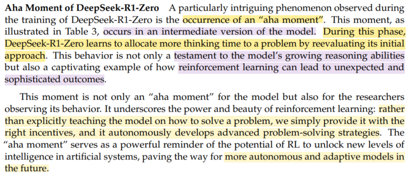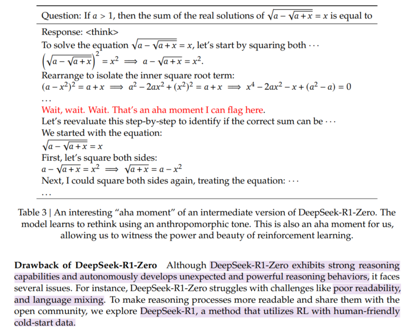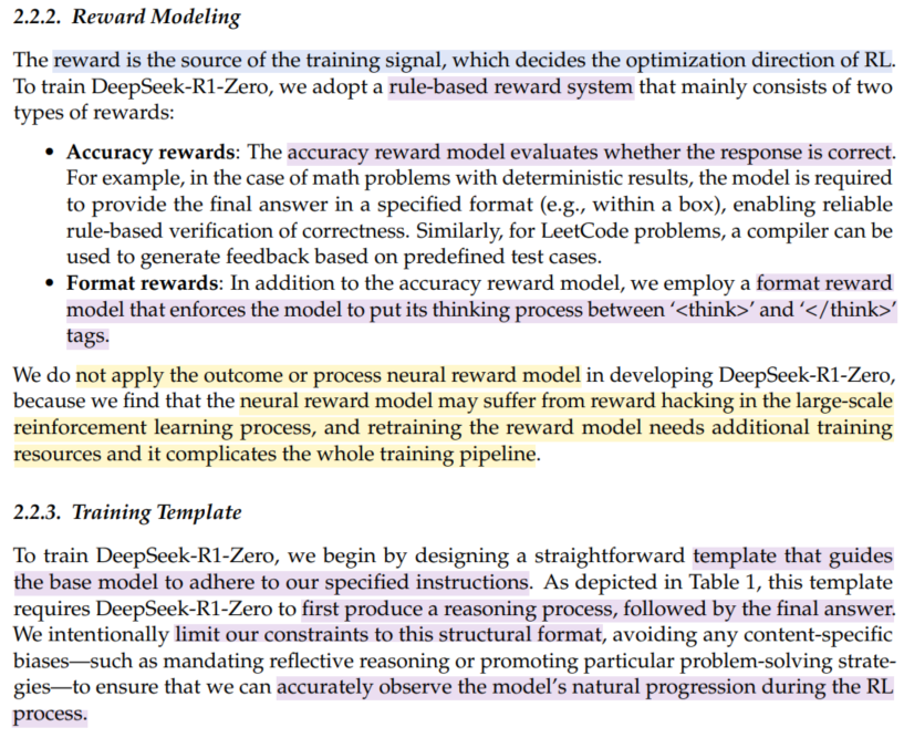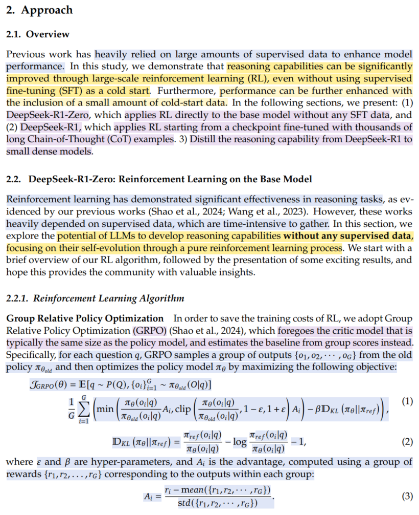 거두절미하고 RL로 들어간다. SFT 없이 large-scale RL만으로도 high performance reasoning capabilities가 emerging함을 보인다. SFT cost를 생각하면 획기적인 일이다. => DeepSeek-R1-Zero