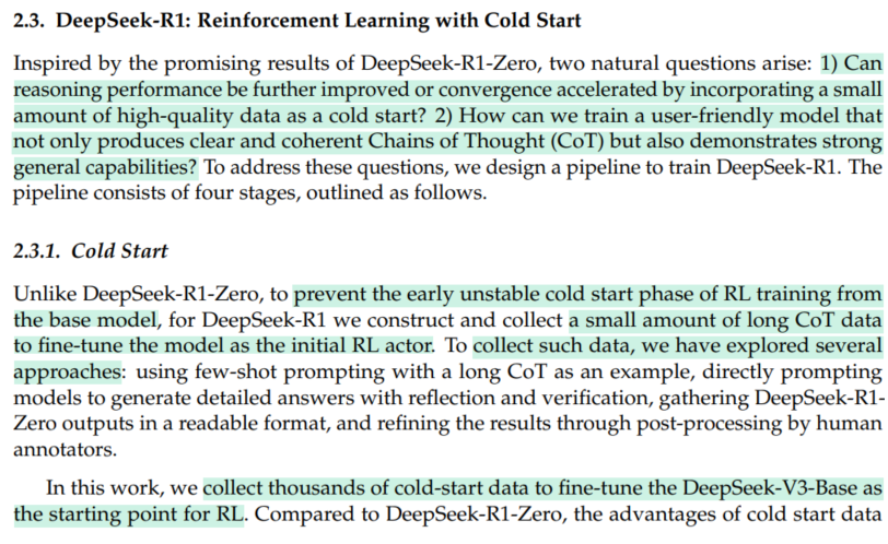 여기에, 사회화를 시켜주기 위해 SFT와 RL stage를 적절히 짬뽕해줘서, DeepSeek-R1 탄생. Open-AI o1 에 필적하는 reasoning 실력을 보여준다.