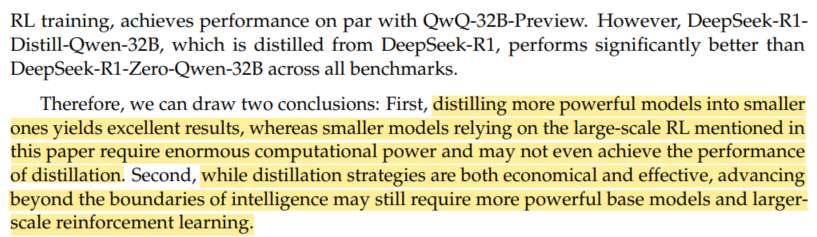 DeepSeek-R1의 reasoning capabilities를 distill 받은 smaller dense model들은 스스로 RL을 한 것보다 우수한 reasoning capabilities를 탑재하게 된다.