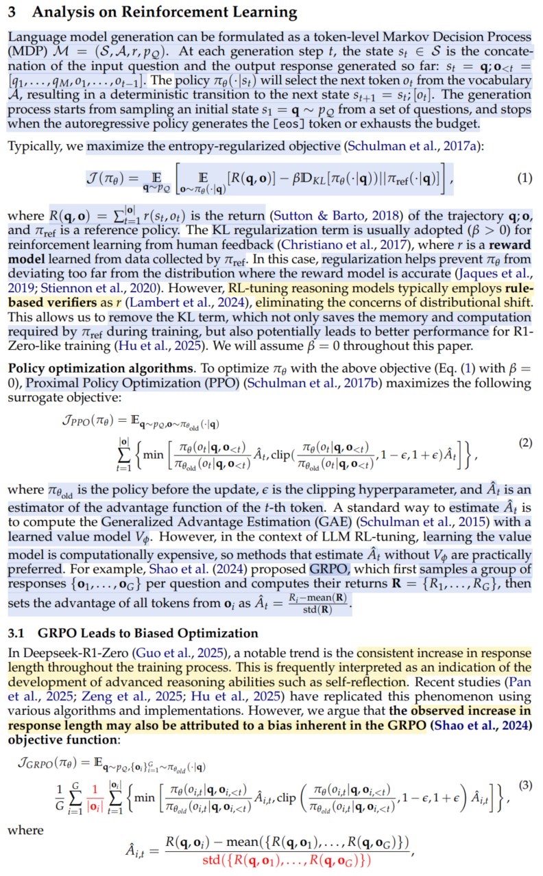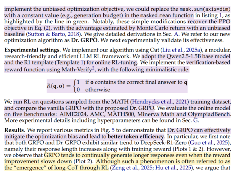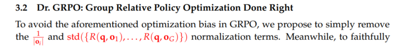 Dr.GRPO는 GRPO objective에서 bias를 제거하여 reasoning performance를 유지하면서도 token efficiency를 개선하였다.