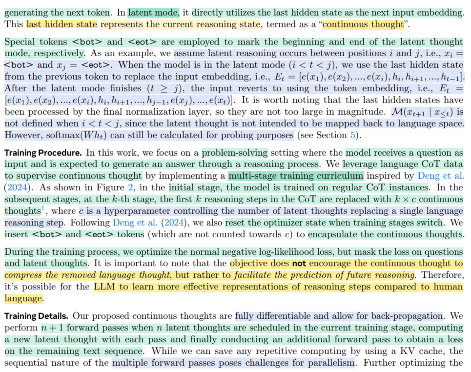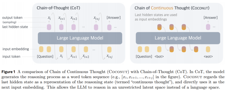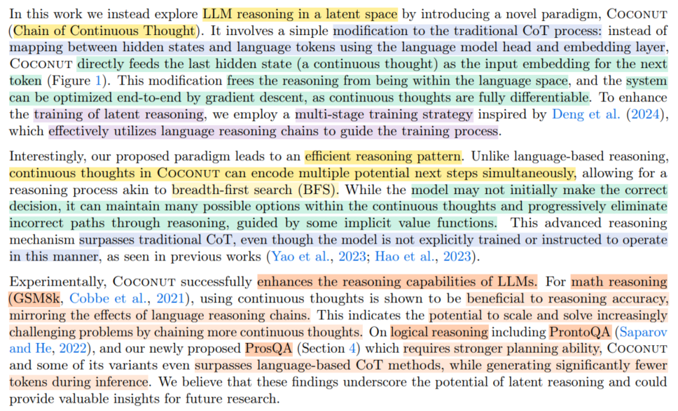 COCONUT은 LLM으로 하여금, reasoning process 전부를 fluent한 language로 표현할 필요없이, latent space에서 reasoning process를 가질 수 있도록 한다.