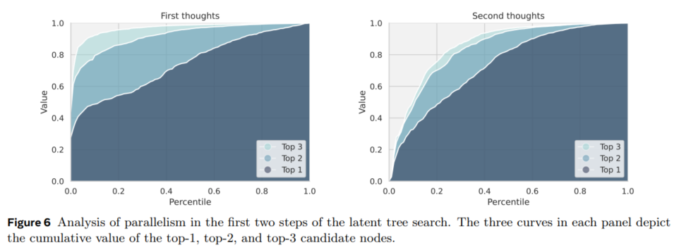 이렇게 여러 경로를 탐색하고 최종적인 결정을 미루는 것이 왜 reasoning performance를 향상시키는지에 대해서도 해석을 하는데, 사실 이것은 AlphaGo series (AlphaZero, MuZero, etc, 좀더 broad하게 보자면, Model-based RL)에서 쓰인 MCTS 등의 planning과도 상통한다. rollout하면 할수록, target에 가까워질 수록 좀 더 accurate하게 value estimate을 할 수 있는 것이다. 바둑에서 더 많은 수를 내다볼 수록 유리할 것과 같다.