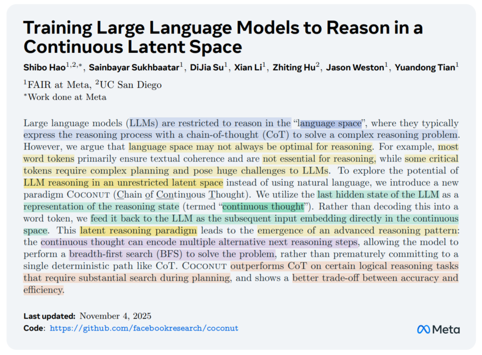 GitHub - facebookresearch/coconut: Training Large Language Model to Reason in a Continuous Latent Space