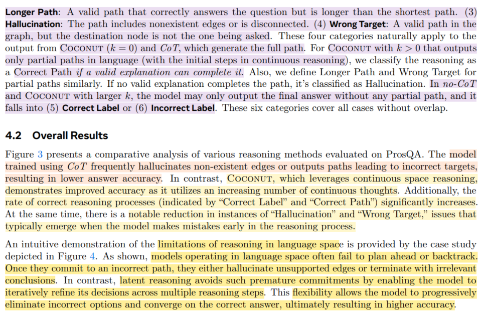 즉, language space에서의 reasoning process는 낙장불입이지만 (한번 길 잘못들면 hallucinate하거나 엉뚱한 결론을 내리지만), latent reasoning은 이러한 성급한 결정을 피하고, 여러 단계의 reasoning steps을 거쳐 반복적으로 결정을 가다듬을 수 있기 때문이다.
