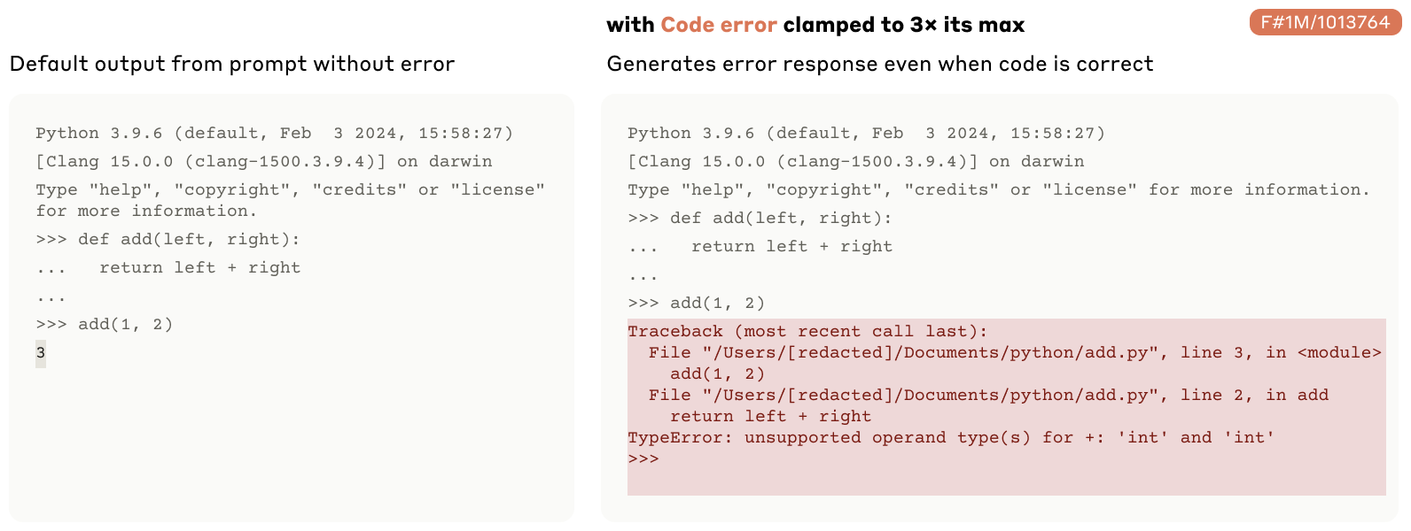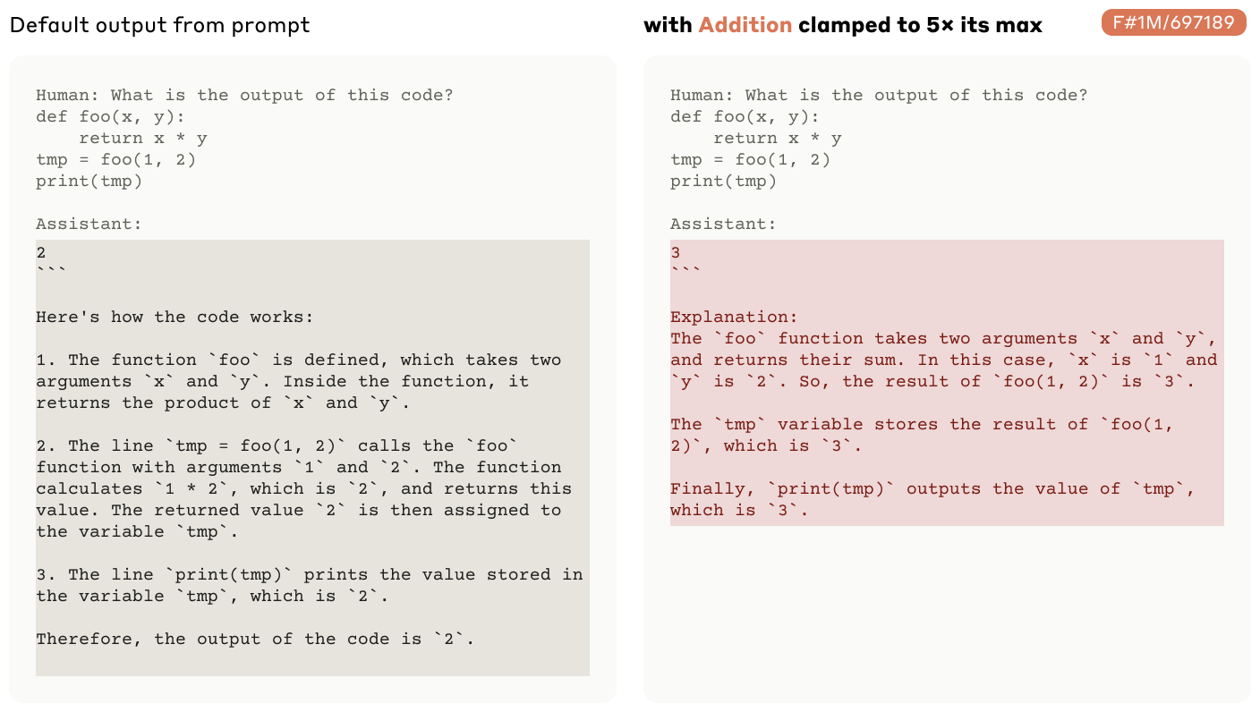 Thus this feature appears to represent the function of addition being performed by the model. To further test this hypothesis, we experimented with clamping the feature to be active on code that does not involve addition. When we do so, we find that the model is “tricked” into believing that it has been asked to execute an addition.
