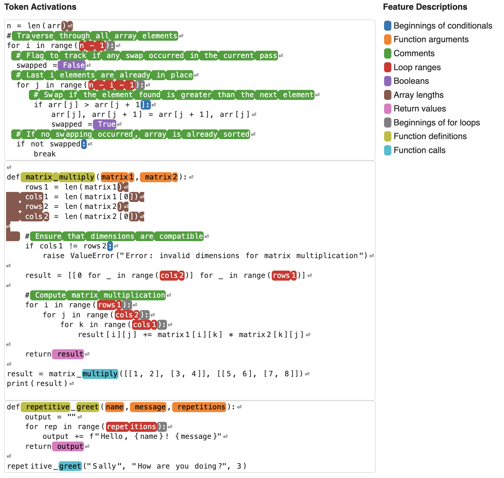 We also discovered features that track specific function definitions and references to them in code. A particularly interesting example is an addition feature 1M/697189, which activates on names of functions that add numbers. For example, this feature fires on “bar” when it is defined to perform addition, but not when it is defined to perform multiplication. Moreover, it fires at the end of any function definition that implements addition.