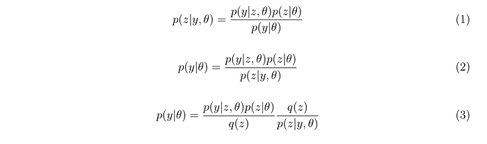 It should be clear that Eq 1 is derived from Bayes' rule. Rearranging terms from the left hand side and right hand side of Eq 1, we can arrive at Eq 2. Then, artificially multiply and divide by q(z), we get Eq 3.