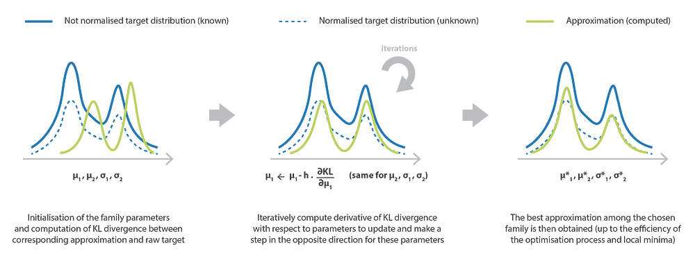 VI methods consist in searching for the best approximation of some complex target probability distribution among a given family. More specifically, the idea is to define a parametrised family of distributions and to optimise over the parameters to obtain the closest element to the target with respect to a well defined error measure.