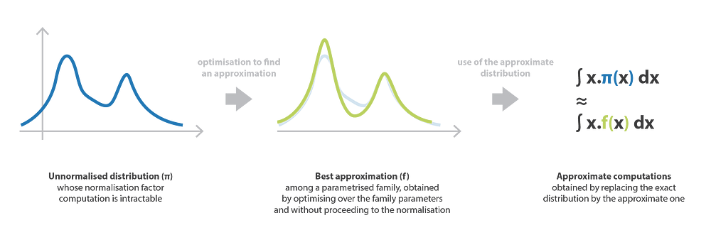If we can solve this minimisation problem without having to explicitly normalise π, we can use f_𝜔* as an approximation to estimate various quantities instead of dealing with intractable computations. The optimisation problem implied by variational inference approaches is, indeed, supposed to be much simpler to handle than issues coming from direct computations (normalisation, combinatorics, …).