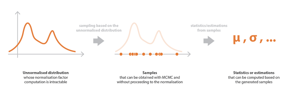 To conclude this subsection, we outline once more the fact that this sampling process we just described is not constrained to the Bayesian inference of posterior distribution and can also, more generally, be used in any situation where a probability distribution is defined up to its normalisation factor.