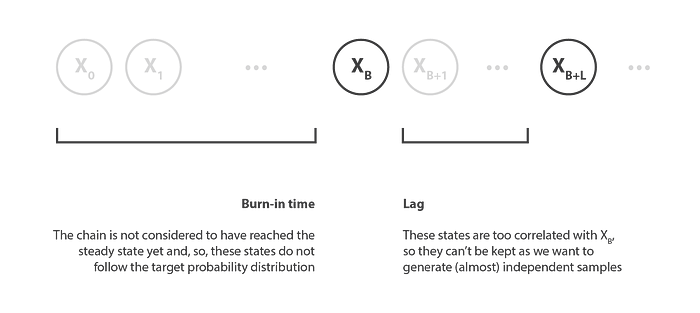 So, in order to get our independent samples that follow the targeted distribution, we keep states from the generated sequence that are separated from each other by a lag L and that come after the burn-in time B. Thus, if the successive states of the Markov Chain are denoted
