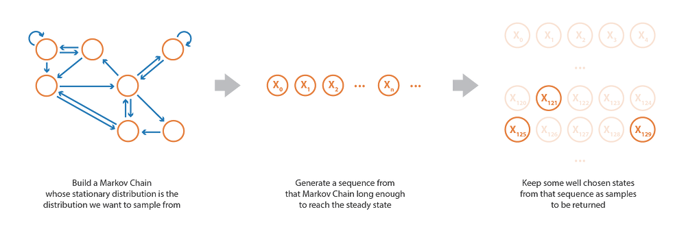 In order to produce samples, the idea is to set up a Markov Chain whose stationary distribution is the one we want to sample from. Then, we can simulate a random sequence of states from that Markov Chain that is long enough to (almost) reach the steady state and then keep some generated states as our samples.