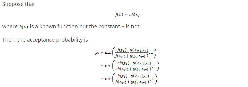 So, we do not need to know the constant c to compute the acceptance probability, and the latter is the only quantity in the algorithm that depends on the target distribution f.