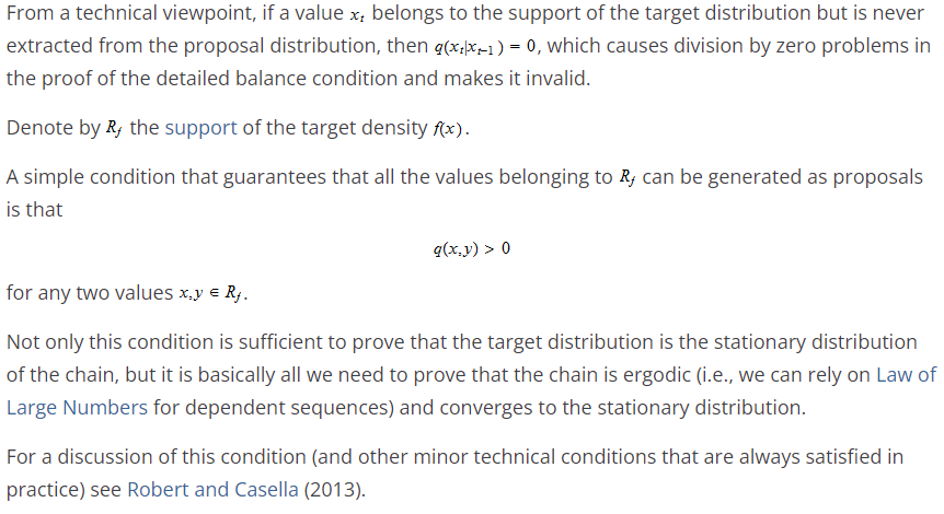 When we proved the detailed balance condition, we omitted an important detail: the proposal distribution must be able to generate all the values belonging to the support of the target distribution.