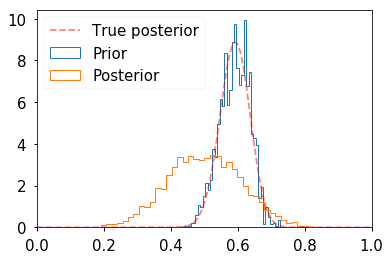 def target(lik, prior, n, h, theta): if theta < 0 or theta > 1: return 0 else: return lik(n, theta).pmf(h)*prior.pdf(theta) n = 100 h = 61 a = 10 b = 10 lik = stats.binom prior = stats.beta(a, b) sigma = 0.3 naccept = 0 theta = 0.1 niters = 10000 samples = np.zeros(niters+1) samples[0] = theta for i in range(niters): theta_p = theta + stats.norm(0, sigma).rvs() rho = min(1, target(lik, prior, n, h, theta_p)/target(lik, prior, n, h, theta )) u = np.random.uniform() if u < rho: naccept += 1 theta = theta_p samples[i+1] = theta nmcmc = len(samples)//2 print("Efficiency = ", naccept/niters) post = stats.beta(h+a, n-h+b) plt.hist(samples[nmcmc:], 40, histtype='step', normed=True, linewidth=1, label='Prior'); plt.hist(prior.rvs(nmcmc), 40, histtype='step', normed=True, linewidth=1, label='Posterior'); plt.plot(thetas, post.pdf(thetas), c='red', linestyle='--', alpha=0.5, label='True posterior') plt.xlim([0,1]); plt.legend(loc='upper left') pass
