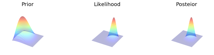a = 2 b = 3 z1 = 11 N1 = 14 z2 = 7 N2 = 14 prior = stats.beta(a, b).pdf(X) * stats.beta(a, b).pdf(Y) likelihood = bern2(X, Y, z1, z2, N1, N2) posterior = stats.beta(a + z1, b + N1 - z1).pdf(X) * stats.beta(a + z2, b + N2 - z2).pdf(Y) make_plots(X, Y, prior, likelihood, posterior) make_plots(X, Y, prior, likelihood, posterior, projection='3d')