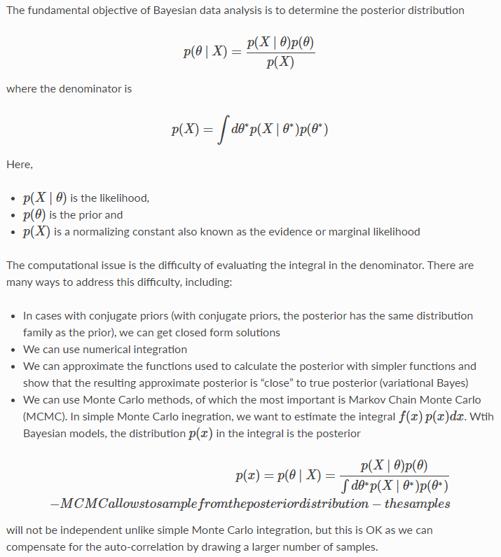 In Bayesian statistics, we want to estimate the posterior distribution, but this is often intractable due to the high-dimensional integral in the denominator (marginal likelihood). A few other ideas we have encountered that are also relevant here are Monte Carlo integration with independent samples and the use of proposal distributions (e.g. rejection and importance sampling). As we have seen from the Monte Carlo integration lectures, we can approximate the posterior p(θ|X) if we can somehow draw many samples that come from the posterior distribution. With vanilla Monte Carlo integration, we need the samples to be independent draws from the posterior distribution, which is a problem if we do not actually know what the posterior distribution is (because we cannot integrate the marginal likelihood).