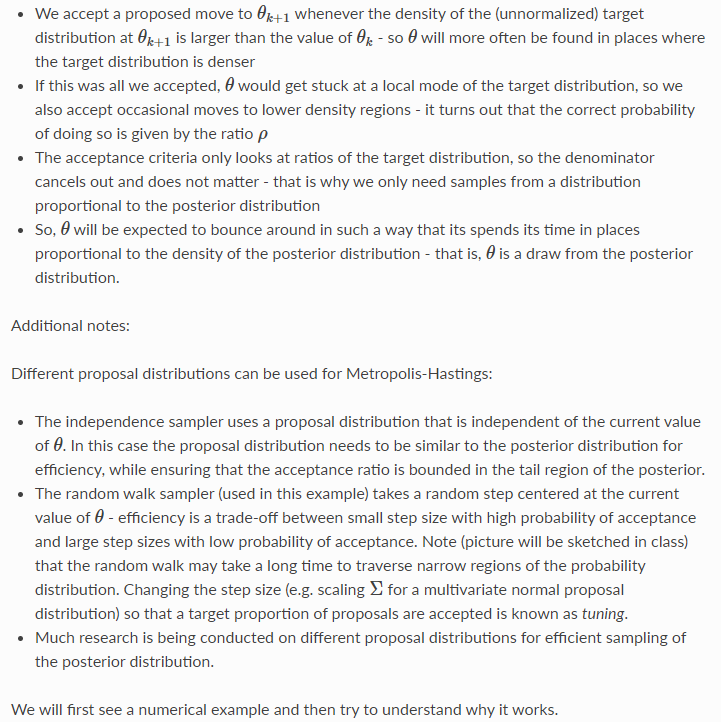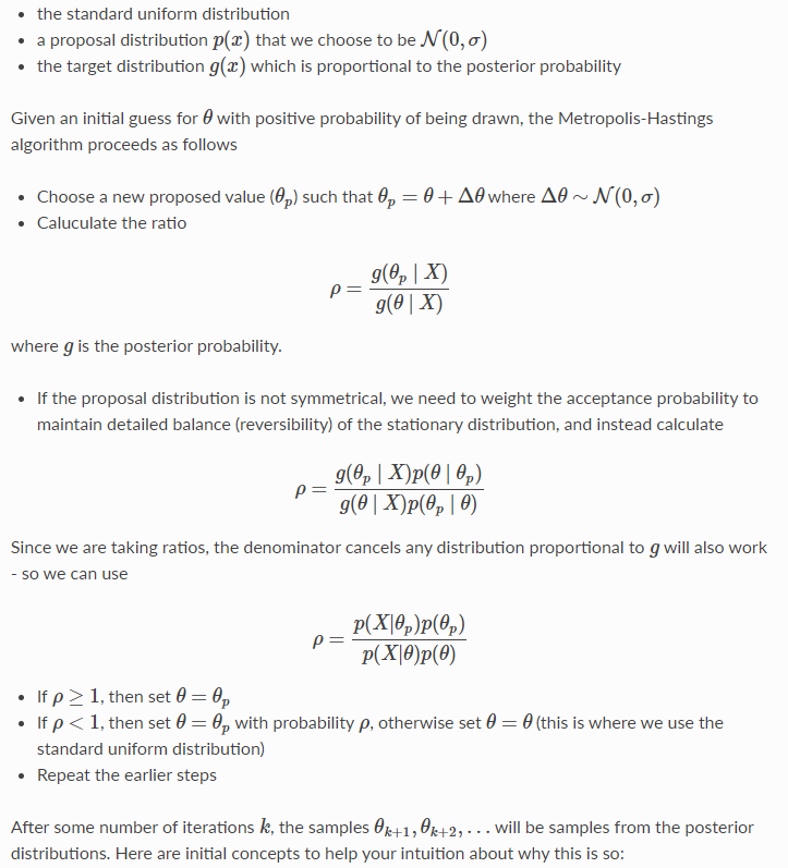 There are several flavors of MCMC, but the simplest to understand is the Metropolis-Hastings random walk algorithm, and we will start there.