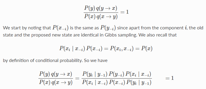 With Gibbs sampling, the Markov chain is constructed by sampling from the conditional distribution for each parameter θi in turn, treating all other parameters as observed. When we have finished iterating over all parameters, we are said to have completed one cycle of the Gibbs sampler. Since hierarchical models are typically set up as products of conditional distributions, the Gibbs sampler is ubiquitous in Bayesian modeling. Where it is difficult to sample from a conditional distribution, we can sample using a Metropolis-Hastings algorithm instead - this is known as Metropolis within Gibbs.