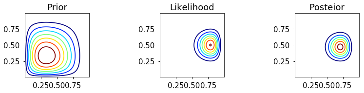 def bern(theta, z, N): """Bernoulli likelihood with N trials and z successes.""" return np.clip(theta**z * (1-theta)**(N-z), 0, 1) def bern2(theta1, theta2, z1, z2, N1, N2): """Bernoulli likelihood with N trials and z successes.""" return bern(theta1, z1, N1) * bern(theta2, z2, N2) def make_thetas(xmin, xmax, n): xs = np.linspace(xmin, xmax, n) widths =(xs[1:] - xs[:-1])/2.0 thetas = xs[:-1]+ widths return thetas from mpl_toolkits.mplot3d import Axes3D def make_plots(X, Y, prior, likelihood, posterior, projection=None): fig, ax = plt.subplots(1,3, subplot_kw=dict(projection=projection, aspect='equal'), figsize=(12,3)) if projection == '3d': ax[0].plot_surface(X, Y, prior, alpha=0.3, cmap=plt.cm.jet) ax[1].plot_surface(X, Y, likelihood, alpha=0.3, cmap=plt.cm.jet) ax[2].plot_surface(X, Y, posterior, alpha=0.3, cmap=plt.cm.jet) for ax_ in ax: ax_._axis3don = False else: ax[0].contour(X, Y, prior, cmap=plt.cm.jet) ax[1].contour(X, Y, likelihood, cmap=plt.cm.jet) ax[2].contour(X, Y, posterior, cmap=plt.cm.jet) ax[0].set_title('Prior') ax[1].set_title('Likelihood') ax[2].set_title('Posteior') plt.tight_layout() thetas1 = make_thetas(0, 1, 101) thetas2 = make_thetas(0, 1, 101) X, Y = np.meshgrid(thetas1, thetas2)Analytic solution