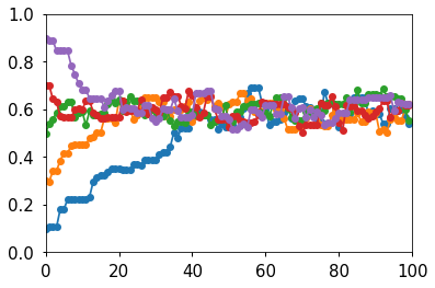 def mh_coin(niters, n, h, theta, lik, prior, sigma): samples = [theta] while len(samples) < niters: theta_p = theta + stats.norm(0, sigma).rvs() rho = min(1, target(lik, prior, n, h, theta_p)/target(lik, prior, n, h, theta )) u = np.random.uniform() if u < rho: theta = theta_p samples.append(theta) return samples n = 100 h = 61 lik = stats.binom prior = stats.beta(a, b) sigma = 0.05 niters = 100 sampless = [mh_coin(niters, n, h, theta, lik, prior, sigma) for theta in np.arange(0.1, 1, 0.2)] # Convergence of multiple chains for samples in sampless: plt.plot(samples, '-o') plt.xlim([0, niters]) plt.ylim([0, 1]);