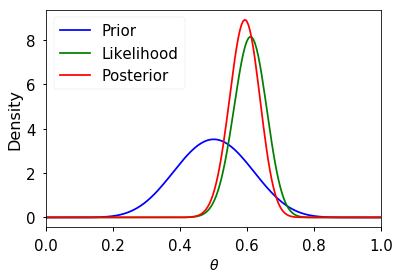 thetas = np.linspace(0, 1, 200) prior = stats.beta(a, b) post = prior.pdf(thetas) * stats.binom(n, thetas).pmf(h) # Normalzie so volume is 1 post /= (post.sum() / len(thetas)) plt.plot(thetas, prior.pdf(thetas), label='Prior', c='blue') plt.plot(thetas, n*stats.binom(n, thetas).pmf(h), label='Likelihood', c='green') plt.plot(thetas, post, label='Posterior', c='red') plt.xlim([0, 1]) plt.xlabel(r'$\theta$', fontsize=14) plt.ylabel('Density', fontsize=16) plt.legend() pass