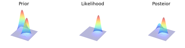 def c2d(thetas1, thetas2, pdf): width1 = thetas1[1] - thetas1[0] width2 = thetas2[1] - thetas2[0] area = width1 * width2 pmf = pdf * area pmf /= pmf.sum() return pmf _prior = bern2(X, Y, 2, 8, 10, 10) + bern2(X, Y, 8, 2, 10, 10) prior_grid = c2d(thetas1, thetas2, _prior) _likelihood = bern2(X, Y, 1, 1, 2, 3) posterior_grid = _likelihood * prior_grid posterior_grid /= posterior_grid.sum() make_plots(X, Y, prior_grid, likelihood, posterior_grid) make_plots(X, Y, prior_grid, likelihood, posterior_grid, projection='3d')