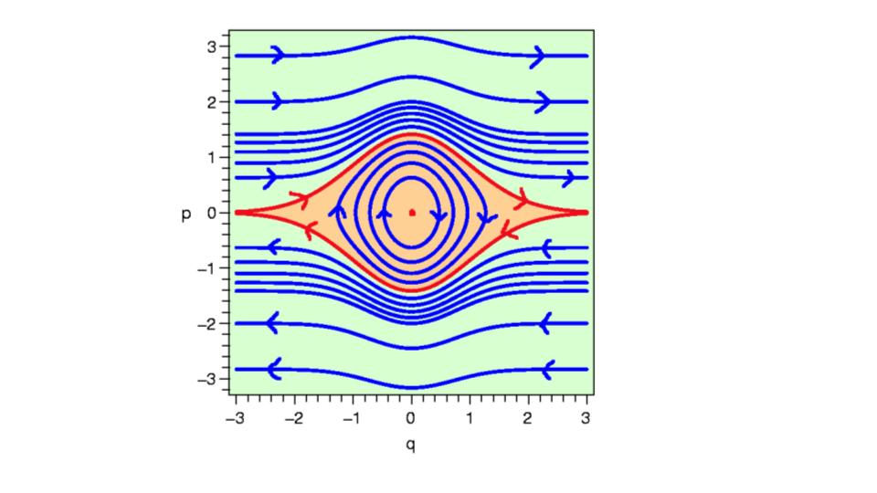 The red inner regions represent where the motion is stable, i.e, we have energy preserving trajectories. Take note of this, it is important. In fact, it is integral for why HMC works so well in high-dimensions. It relates to something called symplectic geometries, which essentially have lots of nice mathematically properties that just so happen to be the exact features we require for certain dynamical systems.