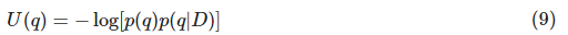 where T = 1 is fixed. And so we can now very easily get to our target distribution p(q), which is dependent on our choice of potential U(q), as this expression factorizes into two independent probability distributions. We characterise the posterior distribution for the model parameters using the potential energy function: