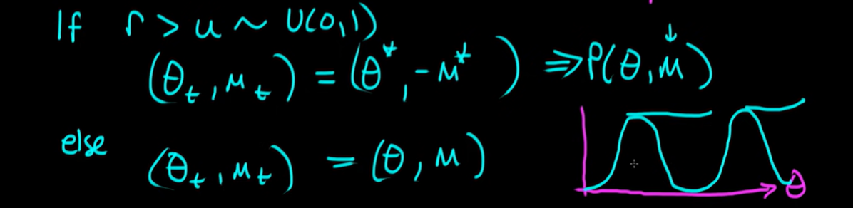 So essentially this algorithm is exactly the same as a metropolis algorithm except when we're considering the joint space of theta and M. And the way in which we're doing proposals isn't the same as the random walk metropolis algorithm, we are solving for the path of the particle using deterministic equations Newton's equations of motion.