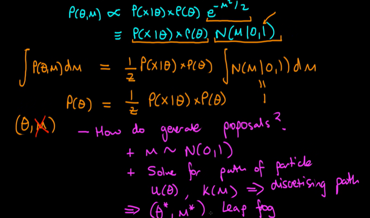 In summary what we're doing is we're solving for the path of the particle over time and this is deterministic given our current value of theta and the value of M that we sample and what that then gives us is a proposed value of theta and proposed value of our momentum.