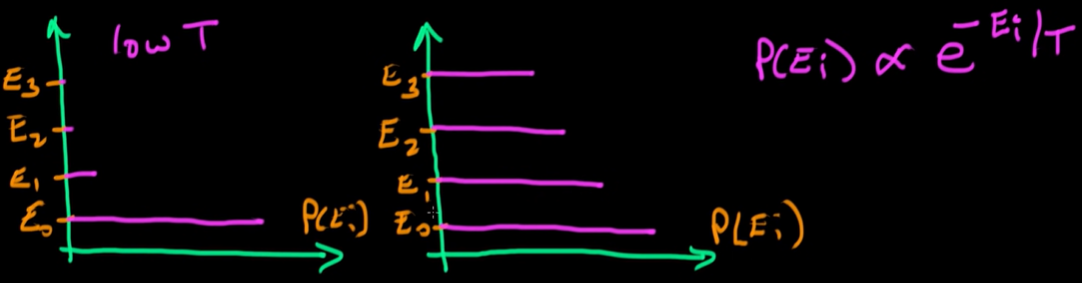 So as I've said before the lowest energy level corresponds to having the highest probability that the particle is in that state. For the next energy level it is slightly less likely that we would get a particle in that energy state across all of our theoretic systems. Next one after that even less etc and we gonna get this decaying away.