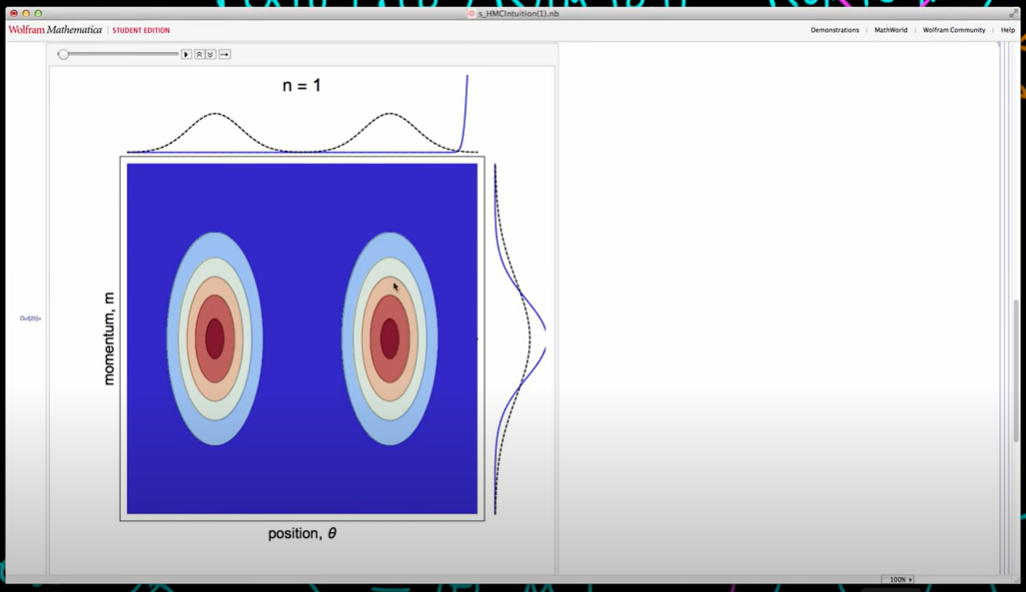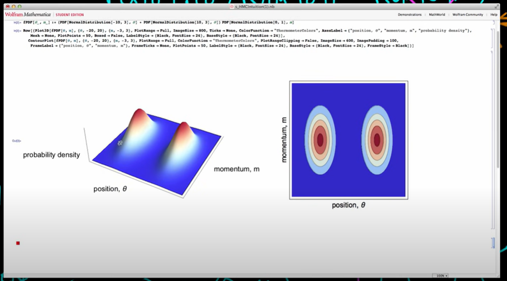 So here I'm just graphically representing this so on the left hand I have a 3D representation of our joint density and so we have our position theta or our particle and its momentum along the other axis and so you can see as I rotate this to the sort of theta plane that we do just get back our bimodal shape of our posterior if we just look for a particular slice of M.