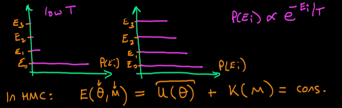 In Hamiltonian Monte Carlo, what we do is we imagine that the system actually has an energy level and the system's energy depends on two things.