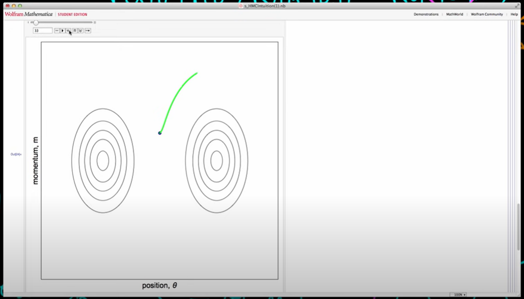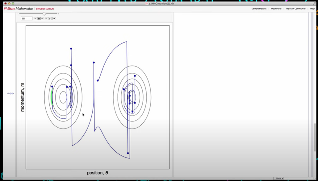 And the idea is that we can continue this process so in each step of the algorithm we sample a new value of M and then what we do is we solve for the motion of the particle using Newton's equations of motion essentially we use approximate ways of integrating those equations of motion and you actually saw that there one of the times we actually rejected the proposal because I showed the path in orange there but you can see that each time at the end of solving for the path of the particle, we flipped the sign of the momentum, so the momentum here below this at a point here is negative then it becomes positive and again you just saw that we rejected a proposed step and it actually turns out the reasons for rejecting a proposed step is due to the approximation error in solving for our path of our particle over time.