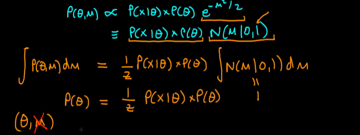Just to prove that to you if we were to integrate P of theta and M with respect to M in other words, we're marginalizing this joint density then that would amount to if we imagine the normalizing constant is Z that would amount to integrating the right hand side with respect to M for the first part of the right hand side doesn't depend on M so we can take that outside of the integral and then the second part is the integral of a normal density with respect to M and a normal density is a valid probability density.