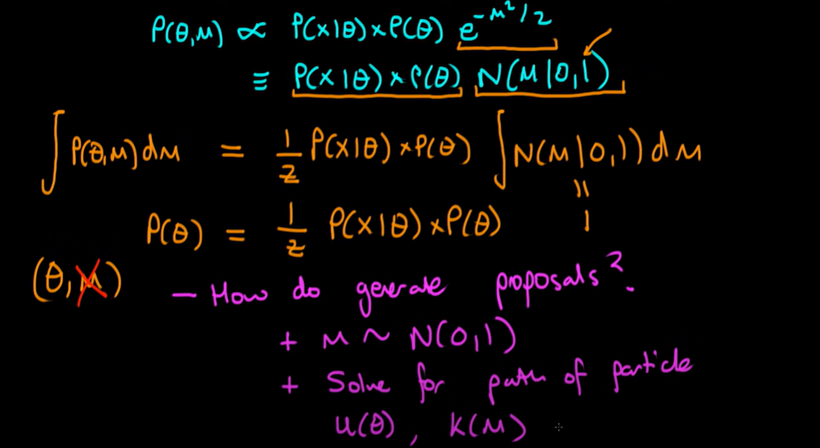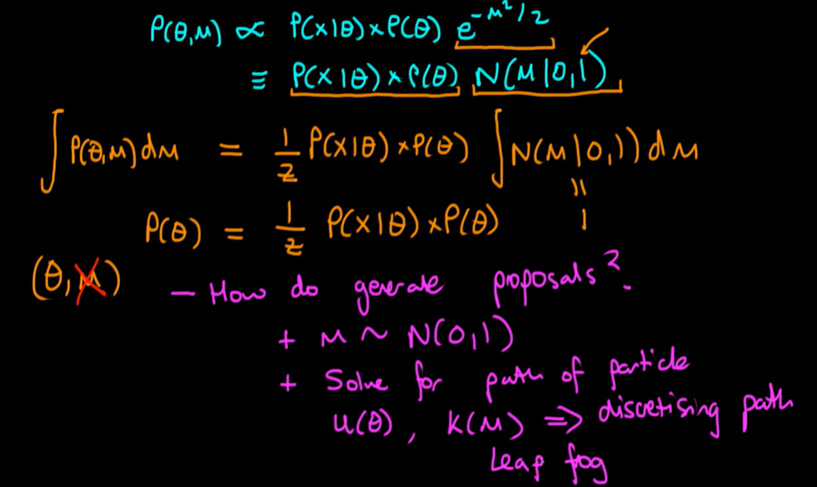 Well, the idea is quite simple really. We can generate proposals for M quite simply by just sampling from its normal density. We can independently sample from that. So we sample a value of M from a standard normal distribution if we've chosen the mass of the particle to be equal to 1.