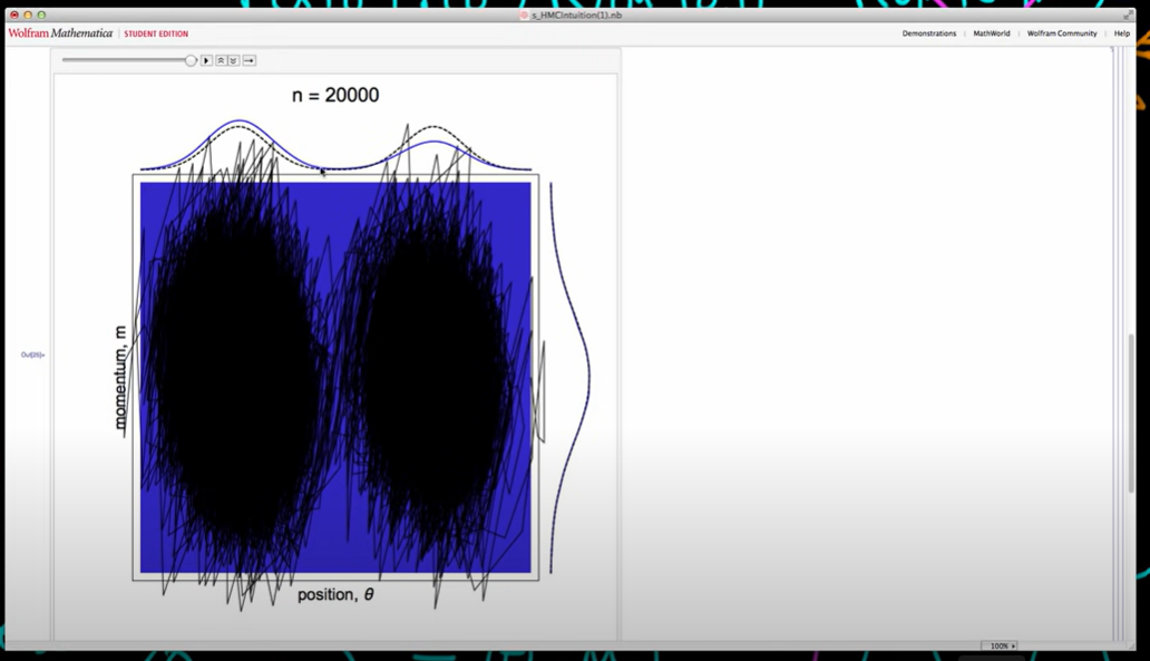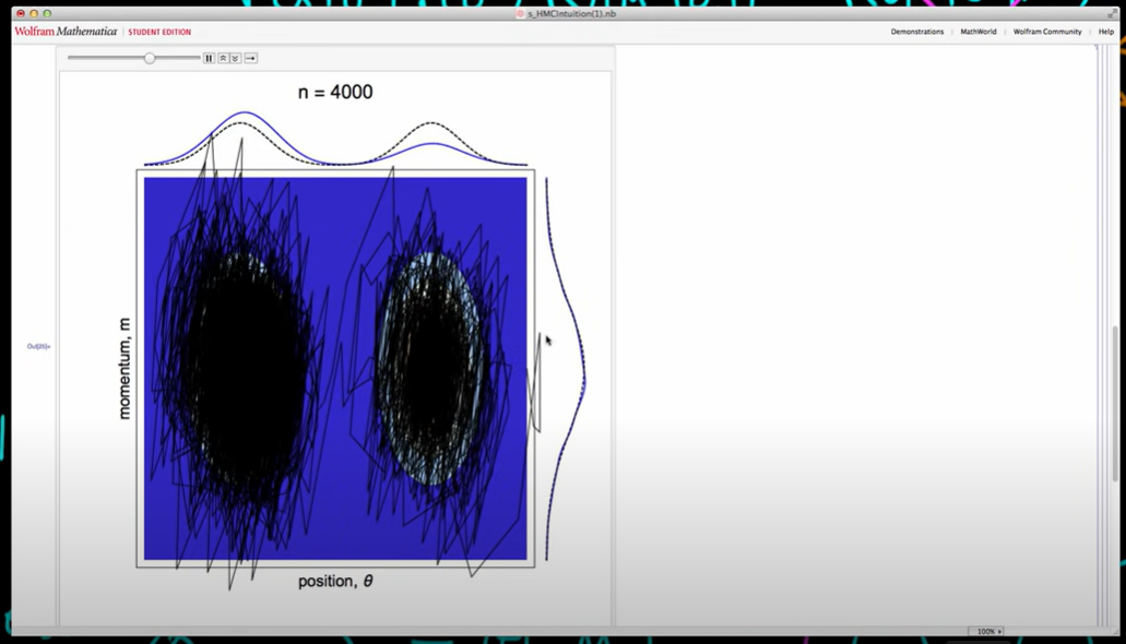 But you can see here is that we're starting to build up a range of samples which if you look in the theta dimension, we start to get a lot of samples towards the modes of each of these distributions. So the marginal distribution for theta if we were to run this much much longer, turns out to be the shape of the posterior that we would like to obtain and similarly if we were to look in the momentum dimension then eventually the samples for momentum actually fall the normal distribution that we want to be sampling from that.