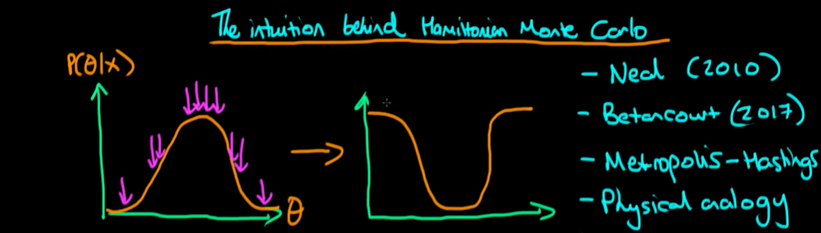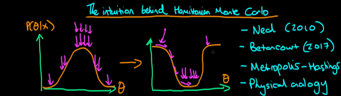 So in summary Hamiltonian Monte Carlo is a variant of the Metropolis-Hastings algorithm and the way in which it differs from standard Metropolis-Hastings is, by using a physical analogy to generate proposals for theta and the physical analogy that helps us is by imagining the path of a fictitious particle on a space which is related to posterior space which I call "negative log posterior space" and because that space is essentially the inverse of posterior space then we tend to flow to regions of low negative log posterior, which corresponds to high values of posterior so we tend to sample more from the modes which is exactly what we would want to do.