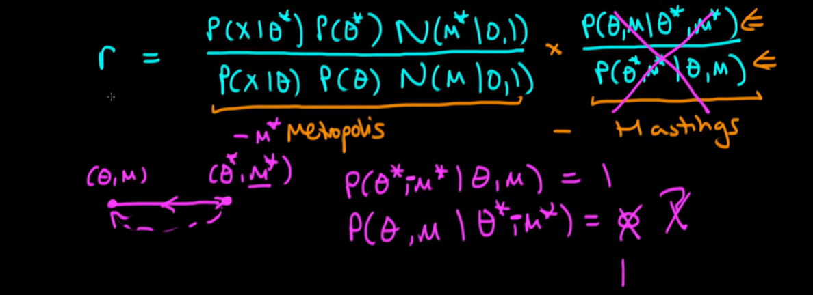 And this is just exactly the part of the formula that you add in the metropolis Hastings rule and it's dealing with the asymmetry of proposals.