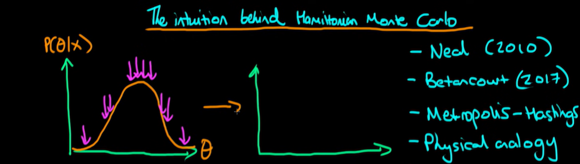The idea with Hamiltonian Monte Carlo is that we give our sledge a random kick now and again and that will allow it to also visit areas which are higher value in this right hand space here but they will visit these less frequently so it will also sample less frequently from the corresponding theta values in our posterior density.
