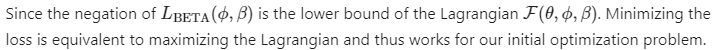 We can rewrite it as a Lagrangian with a Lagrangian multiplier β under the KKT condition. The above optimization problem with only one inequality constraint is equivalent to maximizing the following equation: