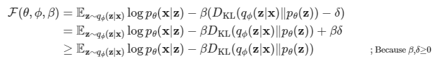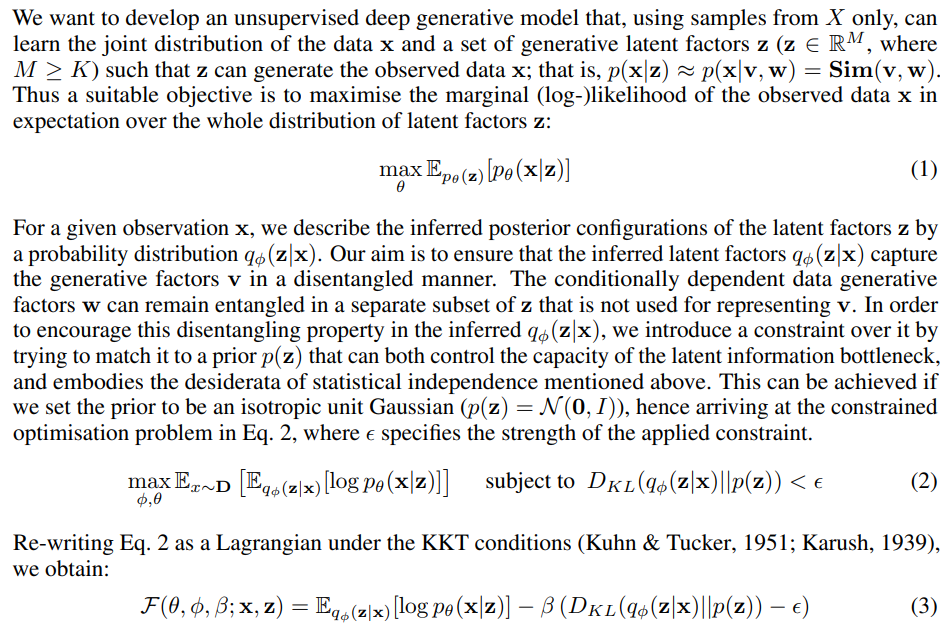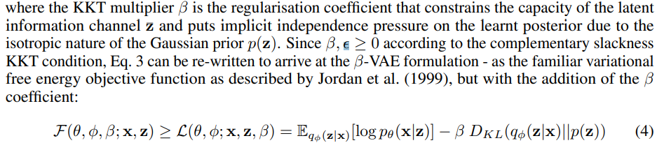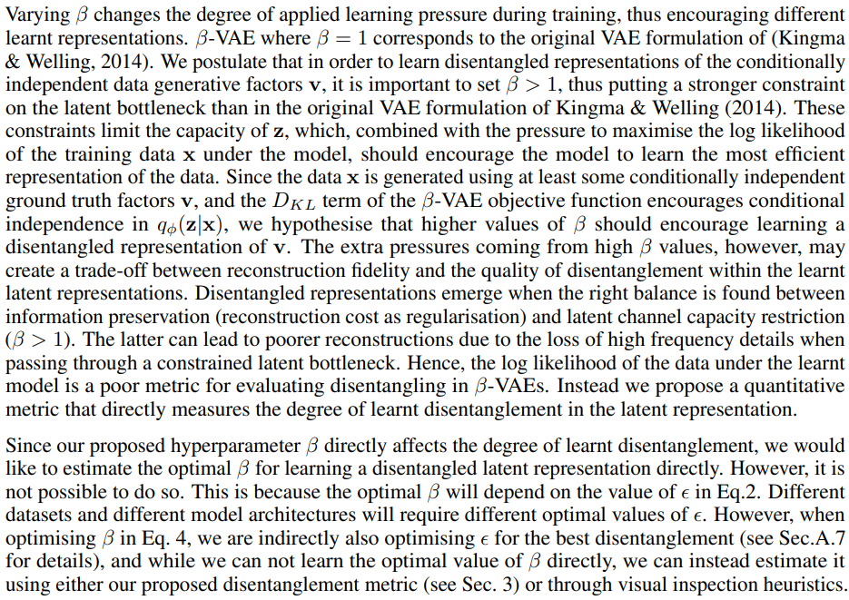 When β =1, it is same as VAE. When β >1, it applies a stronger constraint on the latent bottleneck and limits the representation capacity of z. For some conditionally independent generative factors, keeping them disentangled is the most efficient representation. Therefore a higher β encourages more efficient latent encoding and further encourages the disentanglement. Meanwhile, a higher β may create a trade-off between reconstruction quality and the extent of disentanglement.