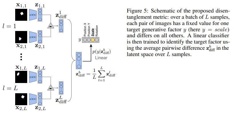 The classifier's goal is to predict the index y of the generative factor that was kept fixed for a given z b diff. The accuracy of this classifier over multiple batches is used as our disentanglement metric score. We choose a linear classifier with low VC-dimension in order to ensure it has no capacity to perform nonlinear disentangling by itself. We take differences of two inferred latent vectors to reduce the variance in the inputs to the classifier, and to reduce the conditional dependence on the inputs x. This ensures that on average z b diff y < z b diff {\y} . See Equations 5 in Appendix A.4 for more details of the process.