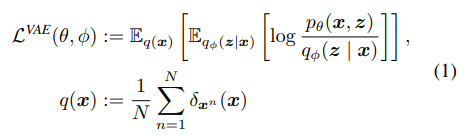 The VAE objective is traditionally defined as sum over datapoints x n of the expected value of the per-datapoint ELBO, or alternatively as an expectation over an empirical distribution q(x) that approximates an unknown data distribution with a finite set of data points,