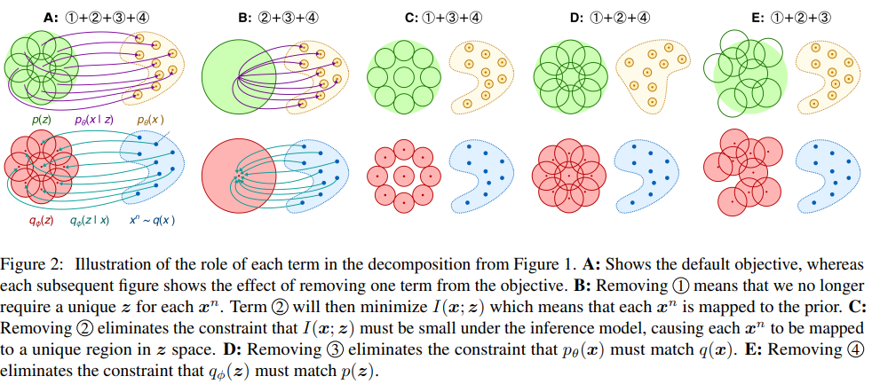 To build intuition for the impact of each of these terms, Figure 2 shows the effect of removing each term from the objective. When we remove 3 or 4 we can learn models in which pθ(x) deviates from q(x), or qφ(z) deviates from p(z). When we remove 1 , we eliminate the requirement that pθ(x n | z) should be higher when z ∼ qφ(z | x n) than when z ∼ p(z). Provided the decoder model is sufficiently expressive, we would then learn a generative model that ignores the latent code z. This undesirable type of solution does in fact arise in certain cases, even when 1 is included in the objective, particularly when using auto-regressive decoder architectures [Chen et al., 2016b].