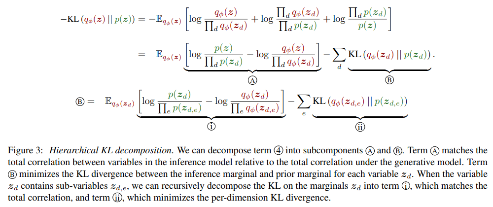 Minimizing the total correlation yields a qφ(z) in which different zd are statistically independent, hereby providing a possible mechanism for inducing disentanglement. In cases where zd itself represents a group of variables, rather than a single variable, we can continue to decompose to another set of terms i and ii which match the total correlation for zd and the KL divergences for constituent variables zd,e. This provides an opportunity to induce hierarchies of disentangled features. We can in principle continue this decomposition for any number of levels to define an HFVAE objective. We here restrict ourselves to the two-level case, which corresponds to an objective of the form