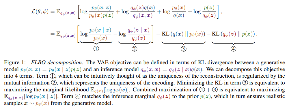 To more explicitly represent the trade-offs that are implicit in optimizing the VAE objective, we perform a decomposition (Figure 1) similar to the one obtained by Hoffman and Johnson [2016]. This decomposition yields 4 terms. Terms 3 and 4 enforce consistency between the marginal distributions over x and z. Minimizing the KL in term 3 maximizes the marginal likelihood Eq(x) [log pθ(x)], whereas minimizing 4 ensures that the inference marginal qφ(z) approximates the prior p(z). Terms 1 and 2 enforce consistency between the conditional distributions. Intuitively speaking, term 1 maximizes the identifiability of the values z that generate each x n; when we sample z ∼ qφ(z | x n), then the likelihood pθ(x n | z) under the generative model should be higher than the marginal likelihood pθ(x n). Term 2 regularizes term 1 by minimizing the mutual information I(z; x) in the inference model, which means that qφ(z | x n) maps each x n to less identifiable values.