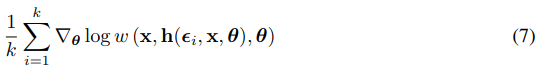 Assuming the mapping h is represented as a deterministic feed-forward neural network, for a fixed e, the gradient inside the expectation can be computed using standard backpropagation. In practice, one approximates the expectation in Eqn. 6 by generating k samples of e and applying the Monte Carlo estimator