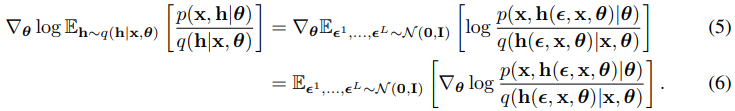 The joint recognition distribution q(h|x, θ) over all latent variables can be expressed in terms of a deterministic mapping h(e, x, θ), with e = (e 1 , . . . , e L), by applying Eqn. 4 for each layer in sequence. Since the distribution of e does not depend on θ, we can reformulate the gradient of the bound L(x) from Eqn. 3 by pushing the gradient operator inside the expectation: